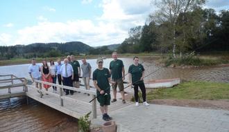 Das Bild zeigt die Übergabe und Inbetriebnahme der vergrößerten Teichanlage mit barrierefreiem Zugang zum Anglersteg.