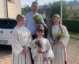 Minis beim Verteilen der Gesegneten Sträußchen an die Gottesdienstbesucher