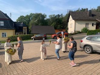Da an diesem Festtag auch die Kräutersegnung stattfindet, waren die Ministranten und einige fleißige Helferinnen und Helfer vom Pfarrgemeinderat schon Tage vorher unterwegs gewesen und hatten fleißig Blumen und Kräuter gesammelt, die sie dann zu kleinen Sträußchen banden. Nach dem Gottesdienst verteilten die Ministranten diese gesegneten Sträußchen an die Gottesdienstbesucher. Pfarrer Fiedler dankte den Ministranten und allen Helferinnen und Helfer für die liebevolle Arbeit, Kräutersträußchen zu binden und diese nun auch an die Kirchenbesucher zu verteilen.
