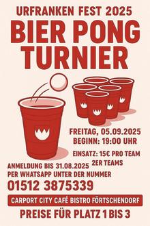 Gleichzeitig veranstaltet die Urfranken-Jugend ein Bier-Pong Turnier im Barbereich. Spaß, Gaudi und leckere Preise winken! Anmeldung der 2er Teams unter: 01512/3875339.
