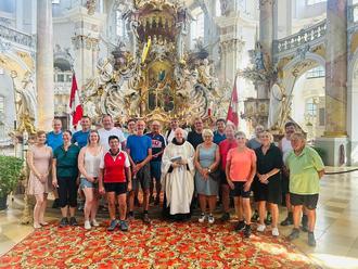 Vor einigen Wochen, Anfang Juli, konnte die Dorferneuerung Friedersdorf mit einer Einweihungsfeier offiziell abgeschlossen werden. Die Freude war riesengroß, handelte es sich doch um eine Baumaßnahme, die sich mit allen Vorgesprächen und Planungen bis zum Abschluss auf über zwei Jahrzehnte zog. Bei der Einweihungsfeier am Gemeinschaftshaus und Dorfplatz gab es Gänsehautgefühl und Emotionen großer Freude. Diese wurde gestärkt durch ein Gelübde von Bürgermeister Stefan Heinlein. Während seiner Dankansprache erinnerte er daran, dass er vor drei Jahren bei seinem Amtsantritt zum Bürgermeisteramt äußerte, "wenn wir die Dorferneuerung Friedersdorf geschafft haben, gehe ich zu Fuß nach Vierzehnheiligen". Schon nach dem damaligen Weihegottesdienst meldeten sich etliche von dieser Aussage gerührte und motivierte Gäste und Ehrengäste zum Mitmachen. Die Basilika Vierzehnheiligen ist eine weltweit bekannte Wallfahrtsstätte und wurde schon von den Vorfahren, wie Flößern und Bergwerksarbeitern zum Ausdruck und zur Ehre Gottes aus großer Dankbarkeit zu Fuß erlaufen. Diesen Beispiel folgend hat sich dieser Tage Bürgermeister Stefan Heinlein, zusammen mit dem "Verpflegungsfahrer", 2. Bürgermeister Wolfgang Förtsch mit einer Abordnung dankbarer Pilger vom Rathaus Pressig aus, früh um vier Uhr, auf den Weg zur Wallfahrtsbasilika Vierzehnheiligen gemacht. Unterstützung erhielt der Verpflegungstransporteur Wolfgang Förtsch durch die Ortssprecherin von Förtschendorf, Christina Kropp und Marktgemeinderätin Susanne Heinlein, die beide die ersten 20 Kilometer zu Fuß gegangen waren und sich dann mit um die Verpflegung der Wallfahrer kümmerten, denn es wurde ein heißer Sommertag. Altbürgermeister Hans Pietz führte dazu eine Radfahrergruppe an. An jedem der Flur- und Feldkreuze betete die Pilgerschar und dankte dem Herrgott und der Gottesmutter Maria für die Gemeinschaft und den Zusammenhalt. Und für eine unfallfreie und gelungene Baumaßnahme in Friedersdorf. Recht dankbar war man auch Bürgermeister Oliver Plewa aus Mitwitz, der die Gruppen mit einem Frühstück in Leutendorf überraschte. In der Basilika angekommen zelebrierte Pater Maximilian einen Dankgottesdienst für die Pilgergruppe aus dem Frankenwald.