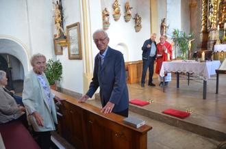Vor Beginn des Gedenkgottesdienstes: Herzliche Begrüßung der 99-jährigen Lehrerin Maria Wachter durch Reinhold Wolf, im Altarraum Pfarrer i.R. Wolfgang Scherbel mit Lektor und Mesner Wolfgang Bergmann.