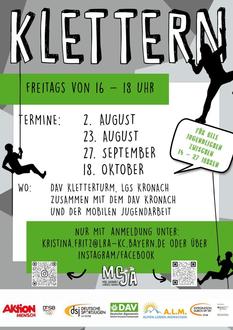 - Kletterprojekt in Kooperation mit dem DAV Sektion Kronach: Anmeldungen sind mindestens eine Woche im Voraus erforderlich, da die Plätze begrenzt sind.