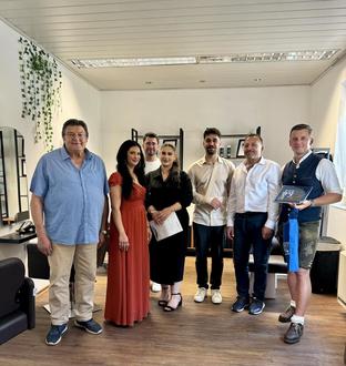 Das Bild zeigt die Gratulanten zur Eröffnung des Friseursalons „Gülo’s Cut“ in Pressig. Von links: 2. Bürgermeister Wolfgang Förtsch, Friseurin Jessica Kobal, Friseur Devrim Dag, Inhaberin Gülhan Güneş, Teilinhaber Melih Alkoyun, Friseur Ghassan Alhallak und Bürgermeister Stefan Heinlein.