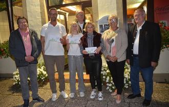 2. Die glücklichen Gewinner der Hauptpreise der AGMP-Tombola: Von links Wolfgang Förtsch, die Gewinner Oliver Kestel, Klara Bauer, Jennifer Kestel, sowie die Vorstandsmitglieder Anita Swiduruk, Hans Michel, im Hintergrund Dieter Kohlmann.
