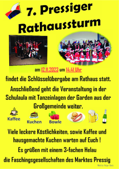 Die Bevölkerung ist herzlich eingeladen, den Rathaussturm mit zu erleben, an Köstlichkeiten und natürlich zum Trinken wird es nicht fehlen.