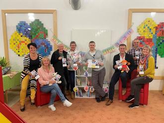 Grund zur Freude über den neuen Flyer hatten von links nach rechts, Kindergartenleitung Maria Kotschenreuther, Kassenprüferinnen Nicole Fehn und Margarethe Michl, Kindergärtnerin Irene Kopp, Schriftführer Thorsten Förtsch, 1. Vorsitzender Stefan Heinlein, Kassier Ulrich Horn und 2. Vorsitzende Caroline Horn.