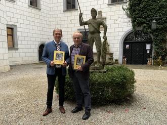 Vor dem steinernen Ritter im Innenhof des Wasserschlosses präsentierten Landrat Klaus Löffler (links) und Kreisheimatpflege-Leiter Bernd Graf die ersten Exemplare des neuen heimatkundlichen Jahrbuchs.