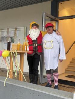 Bürgermeister Stefan Heinlein, als Eilazwerg verkleidet, musste sich der närrischen Übermacht ergeben, zeigte sich aber gut gelaunt und machte den Narren in Reimform etwas Hoffnung auf Reichtümer, denn in den Vorjahren war die Gemeindekasse meistens leer: "Tief im Rathaus hier vergraben, ruhen Schätze groß und schwer; Silber, Gold in reicher Fülle, Edelsteine und noch mehr. Doch bis heute konnte keiner finden den geheimen Ort; denn ich als Zwerg ich unscheinbarer, bin zum Schutz des Schatzes dort. Das Rathaus, steht heut' Kopf - das ist klar, denn Fasching ist halt wunderbar!". Der Bürgermeister gab den Narren auch einige Tipps für ihre neue Aufgabe: "Statt zu streiten und zu klagen, lasst uns lachen und gemeinsam neue Wege wagen! Fokussiert Euch auf das, was zählt, denn nur gemeinsam wird unsere Heimat zum Besten was jedem gefällt! ". Er übergab schließlich unter einer Auflage den Rathausschlüssel: "So füge ich mich nun, ohne großen Streit, meiner Dolonia-Bande, jetzt ist die Zeit. Das Rathaus gebt bitte wieder besenrein zurück, und gebt nicht alles aus, das wär' ein Glück. Ein kleines Startkapital bekommt ihr von uns geschenkt, und denkt daran: Kauft wieder lokal. So lohnt sich das Geld allemal". Zudem gab es wie alle Jahre eine hochprozentige Stärkung, die er mit einem Augenzwinkern ankündigte: "In diesem Jahr, ihr seid sicherlich gespannt, gibt's den Pressiger-Sonnentrank. Als Sonnenschein bin ich bekannt. Es war die Idee zu diesem Trank.". Auch 2. Bürgermeister Wolfgang Förtsch hatte einen Reim parat: "Jetzt soll ich altre Büffel, übergeben den Rathausschlüssel. Aber das ist mir ganz zuwider, am Aschermittwoch haben wir ihn wieder". Im Anschluss ging es in die Schulaula zum Feiern und Sonnenschein-Testen.