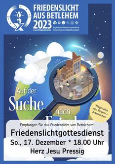 Pressig. Am Sonntag, den 17. Dezember 2023 findet um 18.00 Uhr in der kath. Kirche Herz-Jesu Pressig ein Friedenslichtgottesdienst statt. In diesem Gottesdienst wird das Friedenslicht aus Bethlehem ankommen, welches nach dem Gottesdienst mit nach Hause genommen werden kann. Dieses Licht wird jedes Jahr von einem Kind in Bethlehem entzündet. Ein Flugzeug transportiert das Licht von Bethlehem nach Wien. Von dort bringen es Pfadfinderinnen und Pfadfinder am 3. Advent nach Deutschland. Die Friedenslichtaktion gibt es bereits seit 1986. Der Jugendgottesdienst zum Thema "Auf der Suche nach Frieden" wird inhaltlich von Kindern und Jugendlichen mitgestaltet, die eigens dafür eine Musikgruppe gegründet haben. Der Pfarrgemeinderat Pressig bietet vor dem Gottesdienst Kerzen zum Kauf an, damit auch Sie das Friedenslicht aus Bethlehem mit nach Hause nehmen können.