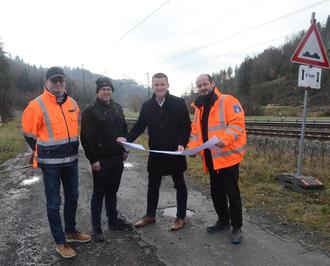 Bei der Ortsbegehung von links, Stefan Fößel (Staatliches Bauamt Bamberg), Bauamtsleiter Markt Pressig, Andreas Schorn, 1. Bürgermeister Stefan Heinlein, Jens Laussmann (Staatliches Bauamt Bamberg)