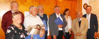 Das Bild zeigt v.li. Angela Konrad,dahinter Vorsitzender Reinhard Horn, Josef Konrad, Hans-Jürgen Konrad, Georg Konrad, Susanne Heinlein, Heinz Hausmann, 1. Bürgermeister Stefan Heinlein