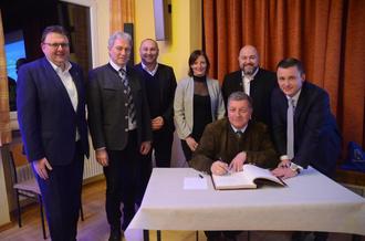 Bild: Eintrag des Bayerischen Staatsministers Christian Bernreiter in das Goldene Buch des Marktes Pressig. Von links: CSU-Kreisvorsitzender Bernd Liebhardt, Landrat Klaus Löffler, MdL Jürgen Baumgärtner, Ortsvorsitzende Susanne Heinlein, MdB Jonas Geissler, Bürgermeister Stefan Heinlein.