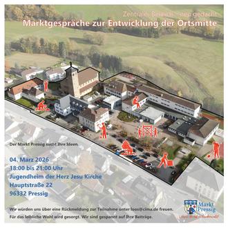 die Gestaltung unserer Ortsmitte in Pressig ist wie das Bahnhofsareal ein weiteres wichtiges Zukunftsthema für unseren gesamten Markt Pressig. Der zentrale Bereich rund um die Herz Jesu Kirche Pressig, das Rathaus sowie die Grund- und Mittelschule möchten wir in Zukunft neu ordnen und nachhaltig aufwerten. Ziel ist es, diesen Bereich zu beleben, attraktiver zu gestalten und hier eine identitätsstiftende Ortsmitte zu entwickeln.