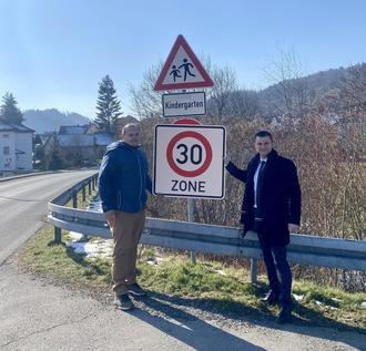 Die ersten Schilder für die Ausschilderung von Tempo 30-Zonen sind schon eingetroffen und werden in den nächsten Tagen aufgestellt. Darauf weisen Bürgermeister Stefan Heinlein (rechts) und der Leiter des Ordnungsamtes Jürgen Fischer, hin.