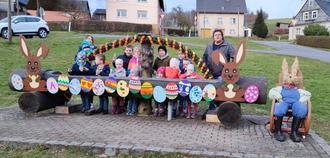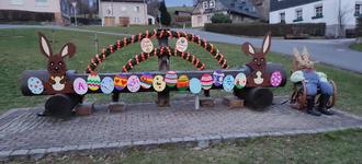 Beim Aufbau waren dann auch die Papas gefordert und an kreativen Ideen fehlte es auch nicht, so wurde der „Osterhase im Schaukelstuhl“ von Franz Wachter erstellt und Krisi und Melanie Förtsch sorgten für die großen „Hasenfiguren“.
