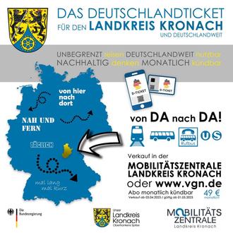 Weitere Informationen zum Kauf des Deutschland-Tickets wie auch zum ÖPNV im Landkreis Kronach gibt es in der Mobilitätszentrale am Kronacher Bahnhof telefonisch unter 09261/678678 oder auch vor Ort zu den üblichen Öffnungszeiten von Montag bis Freitag von 8 bis 13 Uhr sowie von 14 bis 17.30 Uhr. Tiefergehende Informationen zum Deutschland-Ticket sind zudem zu finden auf den Internetseiten des Bayerischen Staatsministeriums für Wohnen, Bau und Verkehr unter https://www.stmb.bayern.de/med/aktuell/archiv/2023/faq_deutschlandticket/ oder des Verbandes Deutscher Verkehrsunternehmen unter https://www.d-ticket.info/