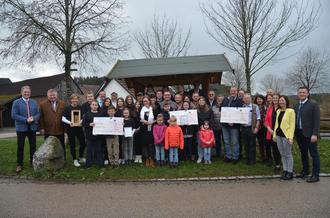 Landrat Klaus Löffler (links), die Pressiger Ministrantengruppe mit Scheck, Preisstifterin Maria Haake (mit weißen Schal), die "Brauersdorfer Mäusgrobe" (mit Scheck), Fischereiverein Pressig (mit Scheck), das Umweltpreis- Orgateam von rechts, Bürgermeister Stefan Heinlein, Mirja Heinlein, Christina Kropp, Susanne Heinlein.