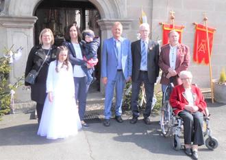 Welitsch (wl) Mit einem Festgottesdienst in der St. Anna-Kirche wurde die Erst-und Jubelkommunion gefeiert. Angeführt von den Ministrantinnen und Ministranten, mit Gemeindereferenten Andreas Roderer(zuständig im Dekanat Teuschnitz u.a. für Erstkommunionvorbereitung, Religionsunterricht in Schulen) und den Aktiven des Musikvereins Pressig begaben sich die Jubilare und das Erstkommunionkind im Zuge vom Gasthaus Müller zur Kirche. Mit feierlicher Orgelmusik (Elke Buckreus) zog man u.a. mit Pfarrer Anton Heinz und Gemeindereferenten Andreas Roderer in die Kirche ein. Die Lesungen trug Angela Konrad vor. Pfarrer Anton Heinz verlas das Evangelium und er führte in seiner Predigt aus, daß das Osterfest das größte Fest der Christenheit sei. In der Folge ging er auf die Auferstehung von Jesus Christus ein und verwies dazu auf die biblische Geschichte von den Jüngern,die nach Emaus unterwegs waren. Besondere Worte galten dem Erstkommunionkind Maya Förtsch, die sich intensiv vorbereitet habe. Die Jubilare erinnerte er an deren Erstkommunion vor 25,40,60 und sogar 80 Jahren. Der Festgottesdienst wurde von den Aktiven der Sängerrunde Welitsch unter der Leitung von Hans Konrad mit den Liedern "Auferstanden ist der Herr", "Vaterunser" und „Ich glaube an die Macht der Liebe " eindrucksvoll mitgestaltet.