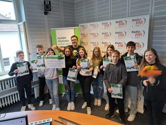 Sie unterstützen dabei voller Begeisterung das Projekt „50000 Bäume für Oberfranken „ des regionalen Radiosenders „Radio EINS“. Zur Übergabe der beachtlichen Summe von 1.170 € für 234 Bäume wurden die 11 Firmlinge zusammen mit ihren 5 Gruppenleitern ins „ Radio EINS“ Studio nach Coburg eingeladen.