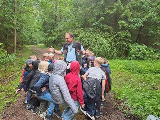 Der letzte Montag im Mai war für die dritte Klasse der Grundschule Pretzfeld ein besonderer Tag. Zusammen mit dem Revierförster Herrn Löhr ging es zum Waldrevier in der Altreuth. Auf dem zweistündigen Weg durch das sehr abwechslungsreich bewachsene Waldgebiet wiederholten wir unser Wissen zu den Baumarten und erfuhren viel Neues zu den Tieren und Aufgaben des Waldes. So lernten wir, dass der Wald ein vielschichtiges Ökosystem ist, in dem Tiere und Pflanzen aber auch wir Menschen gemeinsam leben. Spielerisch veranschaulichte uns Herr Löhr, wie Bäume im Konkurrenzkampf um den besten Platz an der Sonne überleben. Dabei spielten die Schüler Bäume und ein Kind war der Förster, der den Wald immer wieder ausdünnte, damit wenige Bäume kräftig hochwachsen können. Außerdem werden junge Bäume vom Förster eingezäunt, um sie vor Wildfraß zu schützen. Der Wald liefert uns aber nicht nur das Material Holz. Er sorgt für die Sauerstoffzufuhr, speichert Wasser und durch den Erdboden wird es auch gereinigt. Mit den Wurzeln halten die Bäume den Humus, der im Wald durch Laub und tote Bäume entsteht, fest. Wald verhindert also auch gefährliche Erdrutsche vor allem bei Hanglage. Zudem ist er für uns Naherholungsgebiet. So trafen wir auf unserer Waldtour etliche Wanderer und Hundebesitzer. Zudem erfuhren wir, dass leider zu viel Plastikmüll in unsere Natur gelangt, weil wir Menschen zu unachtsam damit umgehen. Nach einer Vesperpause erklärte uns der Förster, dass Bäume sehr alt werden können und tieferliegende Erdschichten schon mehrere tausend Jahre alt sind. Was man da alles herauslesen kann aus einer Hand voll Erde. Außerdem leben darin mehr Lebewesen als Menschen auf der ganzen Welt. Unter dem Humusteil und weiteren Erdschichten befindet sich in der Pretzfelder Umgebung Kalkstein, der sich vor vielen Millionen Jahren am Grund eines weiten Meeres gebildet hat. So kann man dort in den Kalksteinen immer wieder Versteinerungen von Muscheln, Schnecken und anderen Meerestieren finden.