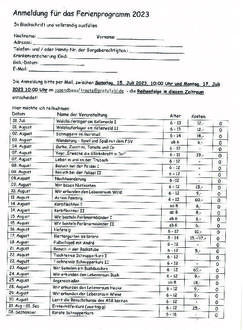 Im Ferienprogramm befindet sich ein Anmeldeformular. Die Vorderseite des Anmeldeformulars müssen eure Sorgeberechtigten unterschreiben.