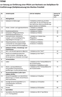 (2) Die Zahl der notwendigen Stellplätze bemisst sich nach der Anlage zur Satzung. Die Anlage ist Bestandteil der Satzung.
