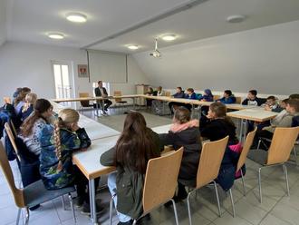 Die 4. Klasse hatte die Gelegenheit, Bürgermeister Steffen Lipfert im Rathaus zu besuchen. Der Bürgermeister empfing die Schülerinnen und Schüler herzlich und erklärte ihnen anschaulich seine Aufgaben und die verschiedenen Ämter, die im Rathaus organisiert sind. Besonders interessiert waren die Kinder am Passamt. Sie informierten sich bei den Verwaltungsangestellten, wie Pässe ausgestellt werden und welche weiteren Aufgaben das Amt übernimmt. Die Schülerinnen und Schüler stellten viele Fragen, die der Bürgermeister geduldig beantwortete. Als Höhepunkt durften sich alle ins goldene Buch der Gemeinde eintragen. Zum Dank überreichten die Kinder dem Bürgermeister ein kleines Geschenk. Auch Bürgermeister Lipfert bedankte sich bei den Viertklässlern mit einem kleinen Präsent. Es war ein spannender und lehrreicher Besuch, der den Kindern die Arbeit im Rathaus näherbrachte und sie für die Aufgaben der Kommunalpolitik begeisterte.