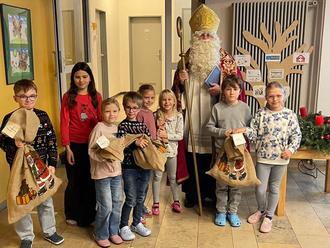 An jedem Montagmorgen trafen sich alle Schülerinnen und Schüler in der Aula zu einer Adventsfeier. Diese wurde immer von einer anderen Klasse mit Liedern und Gedichten gestaltet. Ein besonderer Tag war die Feier nach dem 2. Advent, denn wir bekamen Besuch vom Nikolaus. Das war eine Überraschung! Alle Kinder hatten sich in der Aula versammelt und warteten gespannt. Endlich war es soweit. Nach mehrmaligem Klopfen erschien er in seiner vollen Pracht und begrüßte alle herzlich. Dann lasen die Drittklässler das Bilderbuch „Wach auf Siebenschläfer, Sankt Nikolaus ist da“ vor. Darin gelingt es dem Siebenschläfer Glisglis endlich, sich im Winter wachzuhalten und er trifft den Nikolaus, der allen Tieren des Waldes die wunderbarsten Leckereien mitgebracht hat. Nach dieser warmherzigen Geschichte mit ihren stimmungsvollen Illustrationen las der Nikolaus aus seinem Buch über jede Klasse etwas vor. Er ermunterte die Kinder, einander zu helfen, so wie es der heilige Nikolaus getan hatte. Aber er konnte auch vieles loben und zur Belohnung hatte er für jede Klasse einen großen Sack dabei. Darin waren für alle Kinder kleine Säckchen, gefüllt mit vielen Leckereien. Herzlichen Dank an den Nikolaus Pfarrer Florian Stark!