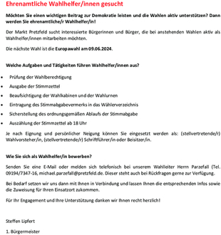 Der Markt Pretzfeld sucht interessierte Bürgerinnen und Bürger, die bei anstehenden Wahlen aktiv als Wahlhelfer/innen mitarbeiten möchten.