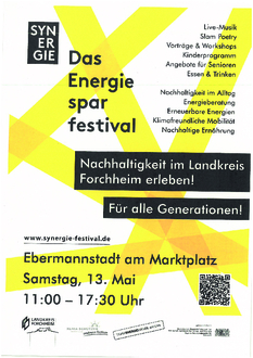 Seien Sie mit dabei, wenn sich am 13. Mai in Ebermannstadt alles rund um die Themen Nachhaltigkeit und Energiesparen dreht. Von Mobilität über Ernährung bis hin zu Erneuerbaren Energien wird die bunte Vielfalt der Nachhaltigkeit auf dem Festival vertreten sein. Lernen Sie die vielen nachhaltigen Projekte und Angebote unseres Landkreises Forchheim kennen! Es erwarten Sie: kreative Workshops, ein abwechslungsreiches Bühnenprogramm, Infostände mit Mitmachangeboten, ein Kinderprogramm, Angebote für Senioren und Seniorinnen sowie Essen und Trinken.