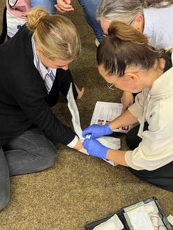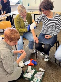 An zwei Nachmittagen, mit insgesamt 9 Wochenstunden, absolvierten die Lehrkräfte einen Erste Hilfe Kurs. Unter der Leitung von Herrn Roos vom Deutschen Roten Kreuz wurde in zahlreichen praxisnahen Übungen gelernt, wie man mit einfachsten Handgriffen Menschenleben retten kann. Inhalte des Kurses waren u.a. Eigenschutz und Absichern von Unfällen, Helfen bei Unfällen, Wundversorgung, Umgang mit Gelenkverletzungen und Knochenbrüchen, Verbrennungen, Hitze-/Kälteschäden, Vergiftungen, lebensrettende Sofortmaßnahmen wie stabile Seitenlage und Wiederbelebung. Ebenfalls wurden die Lehrkräfte in diesem Lehrgang in der Durchführung der richtigen Maßnahmen bei Kindernotfällen geschult.