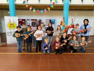Seit diesem Schuljahr gibt es an der Grundschule eine Arbeitsgemeinschaft Ukulele für die 3. und 4. Jahrgangsstufe. 18 Schülerinnen und Schüler lernen seit Oktober mit großer Begeisterung das Spielen auf der Ukulele. Die Ukulele ist ein gitarrenähnliches Zupfinstrument mit (meistens) vier Saiten und vor allem auf Hawaii ein beliebtes Instrument. Mit Spenden des Kinderkleiderbasarteams konnte die Schule mehrere Ukulelen anschaffen, so dass ein Gruppenmusizieren möglich ist. Mittlerweile haben sich die Kinder auch teilweise eigene Instrumente angeschafft, um auch zuhause üben zu können.