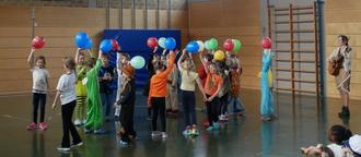 Am Rußigen Freitag feierten die Schülerinnen und Schüler der Klassen 1-6 gemeinsam in der großen Turnhalle Fasching. Mit einem gemeinsamen Einmarsch aller Akteure wurde die Faschingsfeier unter großem Beifall eröffnet. Die Chor- und Kombi-Klasse 1/2 präsentierte mit zahlreichen Luftballons das Lied „Ein großer, ein runder, ein roter Luftballon“. Die Tänzerinnen und Tänzer der Tanz-AG der 1. und 2. Klassen zeigten ihr Können bei drei verschiedenen Tänzen und nahmen das Publikum mit auf eine Reise durch den Dschungel. Traditionell war auch wieder die Minigarde aus Engetried zu Gast, welche ihren beeindruckenden Gardemarsch aufführte und natürlich nicht ohne Zugabe die Bühne verlassen durfte. Leider war Prinz Tim erkrankt, jedoch wurde trotzdem Walzer getanzt: Schülersprecher Leon Schorer und Schulleiterin Christine Räth entschlossen sich spontan, einen Walzer zu tanzen. Auch in diesem Jahr waren die „Manns Brothers“ wieder mit von der Partie und Marvin und Vincent zeigten faszinierende Zaubertricks und bewiesen ihre hellseherischen Fähigkeiten. Emma, Alisa und Lara aus der Klasse 4b hatten extra einen modernen Tanz eingeübt, den Luisa und Jessica aus der Klasse 6 spontan mittanzten. Zum Abschluss verwandelte sich die ganze Turnhalle in einen großen Tanzsaal und alle Schülerinnen und Schüler sowie Lehrkräfte bewegten sich fröhlich zur Musik.