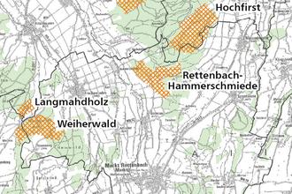 Im Gemeindegebiet Markt Rettenbachs ist vom Planungsverband Donau-Iller die Ausweisung von insgesamt drei Vorranggebieten vorgesehen (in der Karte orange-kariert). Diese liegen vollständig (Rettenbach-Hammerschmiede) oder teilweise (Hochfirst, Weiherwald) auf dem Gebiet der Marktgemeinde Markt Rettenbach.