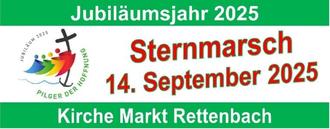 Ursprünglich war im Jahr 2024 anlässlich des 25-jährigen Bestehens unserer Pfarreiengemeinschaft ein Sternmarsch geplant. Dieser musste aufgrund des Hochwassers bekanntlich entfallen. Heuer wollen wir diesen Sternmarsch nachholen und haben als Anlass das Heilige Jahr 2025, das in der gesamten Weltkirche begangen wird. Dieses steht unter dem sehr passenden Motto „Pilger der Hoffnung“. Die ersten „Pilger der Hoffnung“ machen sich ab 08.00 Uhr zu Fuß auf den Weg Richtung Markt Rettenbach. Um 09.30 Uhr setzen sich dann unsere vier Musikkapellen in Bewegung und spielen auf dem Marktplatz im Gemeinschaftschor. Anschließend feiern wir einen Festgottesdienst in der Markt Rettenbacher Pfarrkirche; im Anschluss gibt es im Kirchgarten einen Frühschoppen. Wir laden alle Gläubigen aus unserer Pfarreiengemeinschaft zu dieser Festlichkeit ein und freuen uns auf zahlreiche Teilnahme!
