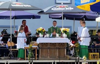Gut beschirmt angesichts hochsommerlichen Wetters waren am 6. Juli beim Schlossfest die Gläubigen, die auf dem Markt Rettenbacher Marktplatz miteinander Gottesdienst feierten. Pfarrer Beck freute sich, die Musiker der „Bundeskapelle Oberau“ (Tirol) begrüßen zu können, welche die „Deutsche Messe“ von Michael Haydn aufführten. Auch wenn es nach einem Wort Jesu nur wenig Arbeiter gebe, so sei auf dem Schlossfest und generell in der Pfarreiengemeinschaft das Gegenteil der Fall, so Beck in der Predigt. Viele fleißige Hände würden helfen, ein solches Fest auf die Beine zu stellen. Nach dem Wettersegen waren alle eingeladen, noch beim Frühschoppen dazubleiben.