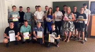 Die Mittelschule Markt Rettenbach durfte nach dem Schuljahr 2022/23 sechzehn Jugendliche aus ihrer Schulzeit entlassen. Besonders erfolgreich waren dabei Tobias Arnold (stehend 1.v.li.) und Tobias Rösch (knieend 1. v.li.) mit jeweils einer 1 vor dem Komma.