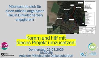 Am Donnerstag, den 23.01.2025 um 18:30 Uhr, seid ihr alle herzlich in die Aula der GMS Dinkelscherben eingeladen, um am ersten Kick-Off Termin für einen geplanten Mountainbike-Trail in Dinkelscherben teilzunehmen. Neben der Firma Schneestern (Trailbaufirma), werden auch der Mountainbike Augsburg e.V. und der Radsport Dinkelscherben e.V. am Termin teilnehmen. Derzeit befinden wir uns in der Anfangsphase und es müssen noch viele Hürden genommen werden, bis das Projekt tatsächlich realisiert werden kann. Deshalb brauchen wir EUCH und EURE Ideen, denn dieses Projekt wird nur mit großem ehrenamtlichem Engagement umzusetzen sein! Es freuen sich auf euer Kommen: