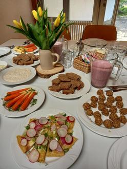 Am Ende konnten alle am gedeckten Tisch das selbst gebackene Brot mit Aufstrich, kleine Powerkugeln, eine Frühlingspizza aus der Pfanne und den gesunden Frühstücksdrink probieren. Besonders praktisch fanden die Mamas, dass alle Frühstücksideen auch prima zu jeder anderen Tageszeit als Hauptmahlzeit oder kleine Zwischenmahlzeit für die Kinder einfach zubereitet werden können. Mit dem kleinen Rezeptheft für jeden können auch die Anregungen aus dem Kurs ganz problemlos im Alltag genutzt werden.