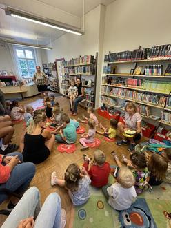 Einmal im Jahr besuchen die Kinder im Gegenzug die Bücherei selbst. Anfang Juli war es wieder so weit: In zwei Gruppen machten sich die Kindergarten- und Krippenkinder auf den Weg zur Bücherei.