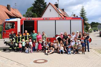 Ein Highlight zum Abschluss des Wald-Maxi-Gruppen Jahres war wieder der Besuch bei der Feuerwehr Dinkelscherben. Abseits des gewohnten Terrains konnten die kleinen Waldzwerge gemeinsam mit ihren Eltern das Feuerwehrhaus erkunden. Herr Aumann zeigte den neugierigen Besuchern allerlei Interessantes und beantwortete alle Fragen von Groß und Klein. Natürlich durften auch alle Mutigen im großen Feuerwehrauto Platz nehmen.