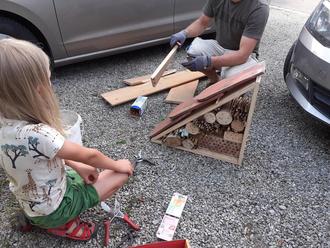Als wir uns am 28. Juni trafen, ging es bei den 6 – 9 -jährigen Kindern um das Thema Kräuter, Blumen und Insekten. Damit es den Insekten im Garten gut geht und sie genug Futter finden, batzelten wir aus Ton, Erde und Wildblumensaatgut Samenbomben – auch Saatkugeln genannt - und bauten in Gemeinschaftsarbeit aus verschiedenen Steinen, Hölzern, Niströhren und markhaltigen Brombeerstängeln ein Insektenhotel für Wildbienen. Beim Zusammenbau unterstützte uns Jan Graß tatkräftig und versah unsere Baumaterialien mit Löchern, damit die Insekten ihre Behausung beziehen können.