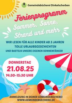 Donnerstag, den 21.08.25 von 14:30 bis 15:30 Uhr für alle Kinder ab 3 „Sommer, Sonne, Strand und mehr“ in deiner Gemeindebücherei in Dinkelscherben.