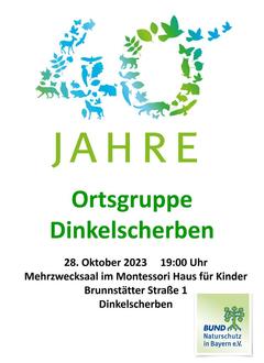 Die BN Ortsgruppe Dinkelscherben feiert dieses Jahr ihr 40 – jähriges Bestehen. Dies ist für uns ein Anlass zum Feiern. Wir laden alle Mitglieder, Freunde und Interessierte ein zu einem gemeinsamen Abend mit Essen, Musik und einer kleinen Rückschau. Wir bitten nach Möglichkeit um Anmeldung unter bn.og.dinkelscherben@gmail.com. Spontan Entschlossene sind ebenfalls herzlich willkommen!