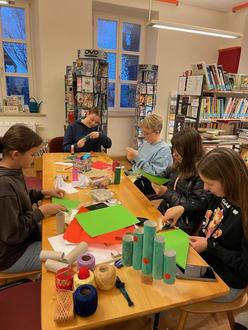 Das Jugendteam von der Bücherei Oberschöneberg lud zum Bastelnachmittag ein. Unter dem Motto „Weihnachtliche Bastelaktion – Wir verschönern die Bücherei“ kamen viele fleißige Kinder. Verschiedene Vorlagen warteten bereits auf sie und so ging es los mit Wasserfarben, Buntpapier und Schere. Eifrig machten sich die Kinder und Jugendlichen an die Arbeit. Die Advents- und Weihnachtslieder im Hintergrund gab die passende Stimmung. Es entstanden tolle Dekorationen für den Büchereiraum. Auch so mancher Stern aus Brotpapiertüten oder Tannenbäume und Engel aus Papprollen nahmen die Kinder mit nach Hause. Ein toller Nachmittag.