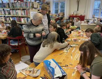 Alle Tische und Stühle waren schnell besetzt und das Jugendteam und Elfriede Leutenmayr hatten viel zu tun, die Bastelarbeiten anzuleiten. Sterne aus Holzstäbchen oder eine lustige Schneemanngirlande waren recht beliebt. Bei dem Falten mit alten Büchern war die Maus der große Renner. Viele versuchten sich auch mit den kleinen und großen Sternen. Viel Spaß hatten die Kinder und Erwachsene und alle waren recht zufrieden mit ihren Kunstwerken.