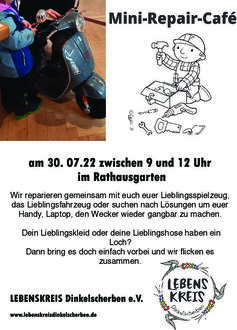 Achtung: Das Mini-Repair-Café ist nicht für Reparaturen von Staubsauger, Küchenmaschine, Plattenspieler, Papas Laptop oder Mamas Fahrrad gedacht. Diese Reparaturen können beim Repair-Café am 06.08. im Pfarrsaal mitgebracht werden.