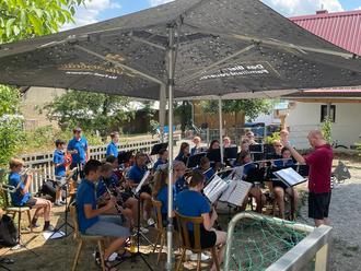 Trotz des überdurchschnittlich heißen Juliwetters fanden sich zahlreiche Besucher anschließend im Außenbereich des St. Anna-Kindergartens zum gemeinsamen Mittagessen und anschließendem Zusammensein bei Kaffee und Kuchen ein, bestens unterhalten durch die Bläsergruppe Dinkelscherben und dem Nachwuchsorchester der Musikvereinigung. Abschließend wurden in der St. Anna-Kirche noch gemeinsam „Lieder für den Frieden“ angestimmt.