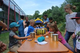 An zahlreichen, mit viel Liebe zum Detail vorbereiteten Stationen konnten sich die großen und kleinen Gäste daraufhin bei allerlei Spielen vergnügen und ihre Geschicklichkeit beweisen sowie beeindruckt die Ergebnisse der Projektwoche bewundern. Darunter begeisterten die Ausstellung von Fadenbildern sowie Fahrzeugen aus Müll und der Neueste Schrei aus Zeitungspapier. Hierbei handelt es sich um eine Modekollektion aus Zeitungspapier. Doch auch sportliche Aktionen kamen nicht zu kurz: egal ob bei der Hüpfburg, einem Kletterparcours, Torwandschießen, Dosen werfen oder einer Rennbahn mit Kettcars- das vielfältige Angebot lies keine Wünsche offen. Anhand eines Parcours konnten die Besucher ausprobieren, wie Helen Keller ihr Leben meisterte. Mit verbundenen Augen musste man sich hierbei mit einem Gehörschutz orientieren. Auch für Bastler und Künstler war einiges geboten: So konnte ein Insektenhotel oder Windspiele gebaut werden oder riesige Seifenblasen gemacht werden. Wer Lust hatte, konnte sich in einem Fotostudio verewigen lassen. Bei einem Marktplatz konnten die Gäste Produkte erwerben, die die Schülerinnen und Schüler während der Projekttage hergestellt haben. Besonders begehrt waren die Produkte aus dem Upcycling-Projekt. Taschen aus alten Jeans, Lampen aus Fahrradteilen sowie alte Möbel in neuem Glanz fanden hier neue Besitzer. Den krönenden Abschluss bildete der Auftritt des Zauberers Phil Rice, der die Gäste in den Bann zog.